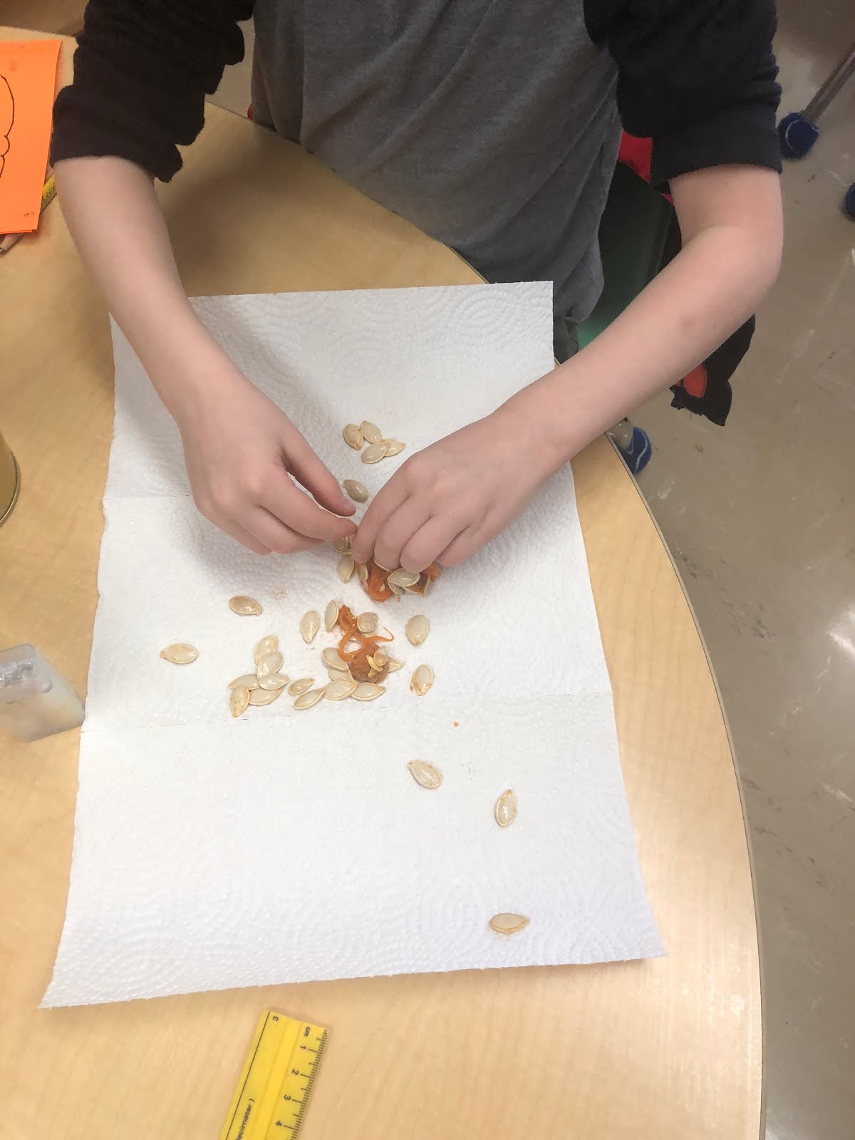 To help us count ALL the pumpkin seeds, we made groups of 10 seeds and skip counted.